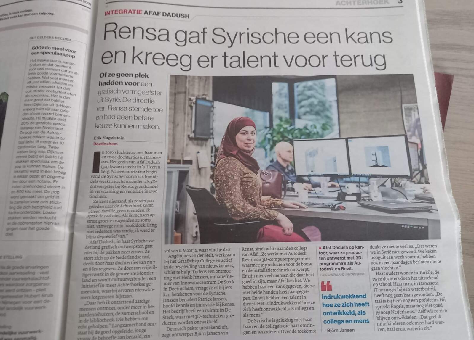 In 2016 vluchtte ze met haar man en twee dochtertjes uit Damascus. Het gezin van Afaf Dadush (34) kwam terecht in ’s-Heerenberg. Na een moeizaam begin vond de Syrische haar draai. Inmiddels werkt ze acht maanden als 3D-ontwerpster bij Rensa, groothandel in verwarming en ventilatie in Doetinchem.